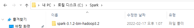 설치가 완료되면 해당 파일을 본인의 C: 드라이브에 Spark라는 폴더를 생성하여 넣어주자. Hadoop을 옮겨놓을 파일도 만들어 두자 (C:\Hadoop)