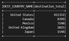 flightData2015 데이터를 DEST_COUNTRY_NAME을 기준으로 그룹화 해준 후 count를 합산한다. 그 후 withColumnRenamed를 통해 column 이름을 변환해주고 destination_total의 역순을 기준으로 정렬 해준다. 마지막으로 limit(5)를 통해 5개를 제한한 후 show()로 출력해준다. 위 코드를 수행한 결과는 아래와 같다.