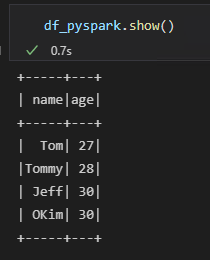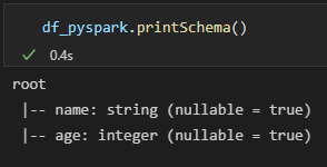 option에서 header : true를 지정해주면 csv 파일의 첫번째 행을 열이름으로 인식하고 가지고 온다. inferSchema는 각 열의 Schema 를 가지고와서 해당 열이 숫자인지, 문자인지를 판단하여 Schema를 설정해준다. printSchema()를 통해 해당 변수의 Schema를 볼 수 있다. option('inferSchema','true')로 지정해주었기 때문에 age는 integer로 잡히는 것을 확인할 수 있다.