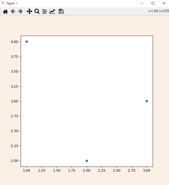 ax.scatter([2, 3, 1], [2, 3, 4])