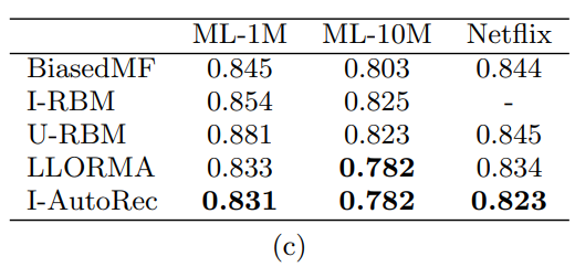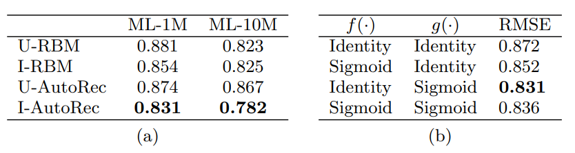 UBCF에 비해 IBCF의 성능이 좋은 것처럼 U-AutoRec보다는 I-AutoRec의 성능이 좋은 것을 확인할 수 있다. 본 논문에서는 RBM과 AutoRec 모두 일반적으로 User based보다 Item based의 성능이 좋게 나온 것을 확인하였고, 그 이유로는 아이템에 측정된 평점 수가 사용자가 아이템에 대해 측정한 평점 수 보다 많기 때문에(덜 sparse 하기 때문) 더 좋은 성능이 나온다고 했다. 또한 AutoRec의 모든 모델이 모든 RBM 보다 성능이 좋은 것을 확인했다.