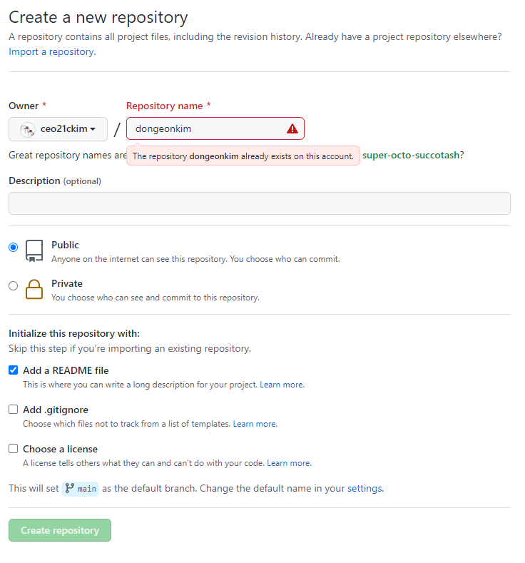 일단 github에 작성하기 위해서는 새로운 레파지토리를 생성해야 된다. 대부분의 경우 본인 이름을 레파지토리 이름으로 설정한다. 우리는 레파지토리 내에 READBE.md 라는 파일을 통하여 꾸미기 때문에 'Add a README.md file'을 체크해주자. 또한, Public을 체크해주어야지만 남들이 우리의 레파지토리를 볼 수 있다.