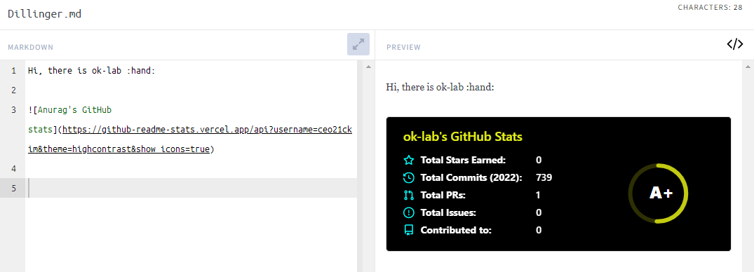 위와 같이 github의 username을 통해서 프로필을 가지고올 수 있는데 내 경우에는 739 commit이라.. 비루하다.. PRs는 pull Requests이다.