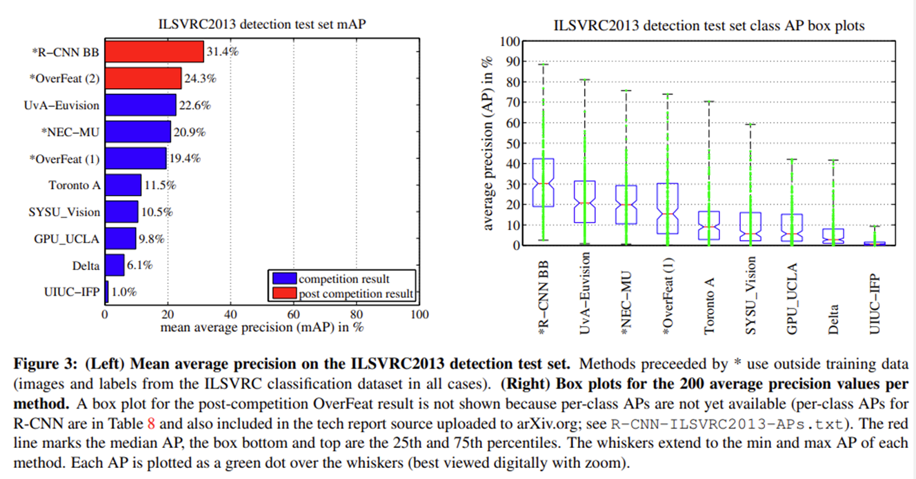 본 논문에서는 SVM classifier를 사용하는 R-CNN과 Bounding box regression을 사용하는 R-CNN BB를 ILSVRC2013 object dataset에 테스트 해보았는데, R-CNN BB의 성능이 훨씬 더 우수한 것을 확인하였다. (PASCAL VOC 데이터 셋에서도 동일하게 R-CNN BB의 성능이 우수하다.)