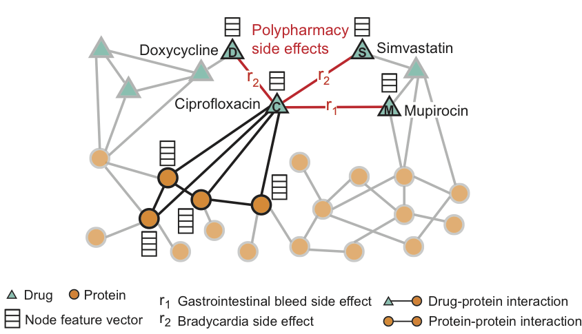 많은 환자들이 Complex 하거나 coexsting하는 질병들을 치료하기 위해 사람의 46%가 70대까지 5종류 이상의 약물을 복용하고 있다. 심장병, 우울증, 불면증을 가진 사람들은 20 종류가 넘는 약을 봉용하기도 한다. 다양한 종류의 약을 복용할 때 같이 복용하면 안되는 약물이 존재할 수도 있다. 이때 그래프를 이용하여 서로 다른 약물을 복용했을 때의 부작용을 예측한다.