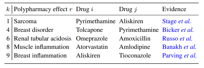 이때 약물과 프로틴 간의 interaction을 고려하고, 약물과 약물 간의 interaction을 통해 부작용(adverse side effect)을 찾아낼 수 있다. [논문] $C$와 $M$의 관계를 나타내는 $r_1$을 통해 두 가지 약물을 복용했을 때의 부작용을 찾는다.