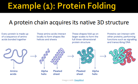 Protein Folding은 최근에 발표된 내용이다. Protein은 Amiono acids의 Sequence한 구조로 구성되어 있다. 그러나 magnetic과 force 때문에 매우 복잡한 형태로 접히거나 쇠사슬 구조를 가지게 된다.