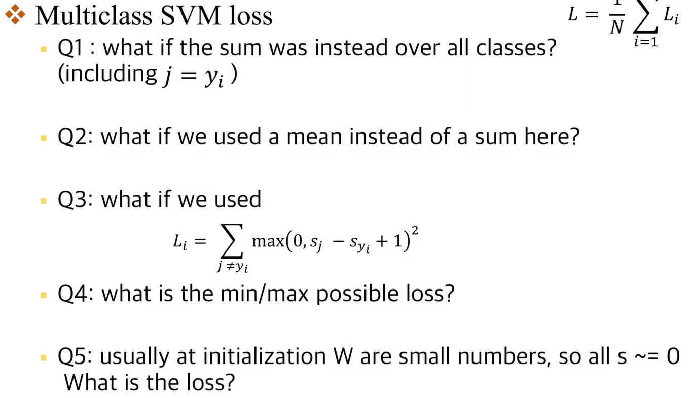 A5 : loss 는 각각 class에 대해 1값을 가지게 된다. 하지만 $s_{y_{i}}$는 제외하기 때문에 $ 1 \over n-1 $이 되게 된다.