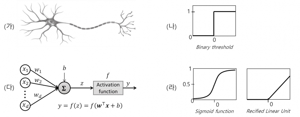 초기의 인경신공망 모형이고 퍼셉트론이 동작하는 방식은 다음과 같다. 각 노드의 가중치와 입력치를 곱한 것을 모두 합한 값이 활성함수에 의해 판단되는데, 그 값이 임계치(보통 0)보다 크면 뉴런이 활성화되고 결과값으로 1을 출력한다. 뉴런이 활성화되지 않으면 결과값으로 -1을 출력한다.