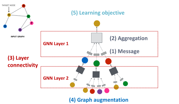 Message Passing은 각각의 노드의 Representation Vector를 계속해서 update 해가는 과정을 의미한다. 이웃 노드와 엣지의 Representation Vector를 transforming하고 aggregating하면서 계속해서 노드를 Representation Vector를 update하는 것이다.