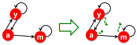 위 구조를 Spider Trap이라 부른다. 이 경우 처음에는 $r_a, r_b$가 [1, 0] 의 값을 가지지만, 1번 반복하는 경우 node b에서 빠져나올 수 없어 $r_a, r_b$는 [0, 1]의 고정된 값을 가지게 된다. 이렇게 되면 node의 중요도는 무시된 채 node b가 가장 중요한 node로 판단되기 때문에 문제가 된다. 이 경우에는 self-loop로 매우 간단한 예제이지만, cycle 구조를 가진 경우에도 발생할 수 있다.