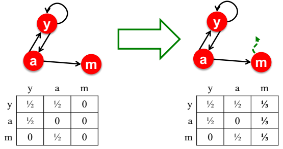 Dead ends에서 빠져나오기 위해서는 dead end에서 다른 node로 이동할 확률을 균등하게 분배해 무작위로 teleport하는 것이다. 원래의 node m에서는 out-link가 없기 때문에 column의 합이 0이지만, node y, a, m에 각각 균등하게 1/3의 값을 부여해 teleport할 확률을 부여한다. 이와 같은 방식을 통해 Dead end에서 빠져나올 수 있다.