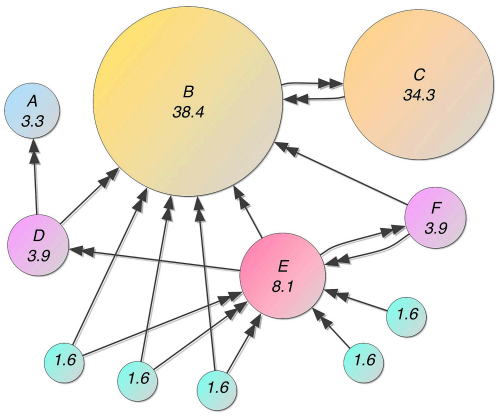 오른쪽 그림의 경우 node B의 중요도가 가장 높다. node E의 경우 in-link가 node B와 동일한 수를 가지고 있으나, in-link로 연결된 node들이 별로 중요하지 않은 node들이다. 따라서, 상대적으로 중요도가 높은 node와 in-link 관계를 가지고 있는 node B의 중요도가 node E에 비해 높은 것을 확인할 수 있다. 또한, node A의 경우 Dead ends이지만 중요도가 측정되는 것을 확인할 수 있다. node C의 경우 in-link가 node B에 대해서만 존재하지만 중요도는 높게 측정되었다.