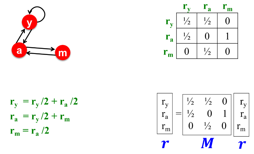 \[ r = M \cdot r, \ \ r_j = \sum_{i \rightarrow j}\frac{r_i}{d_i} \]