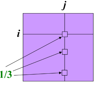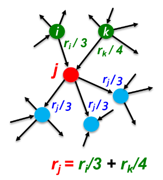 \[ r_j = \frac{r_i}{d_i} + \frac{r_k}{d_k} = \sum_{i \rightarrow j} \frac{r_i}{d_i} \]