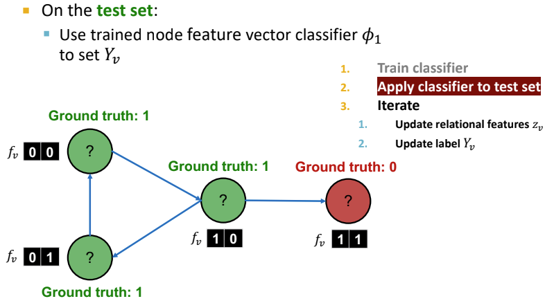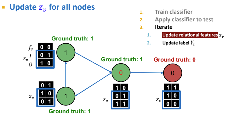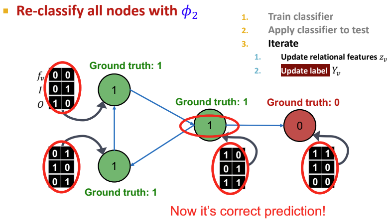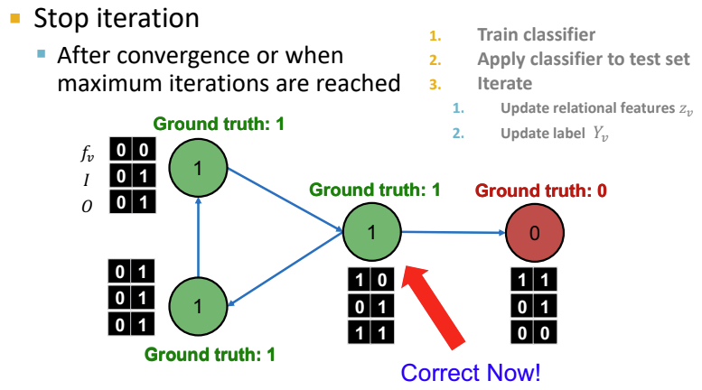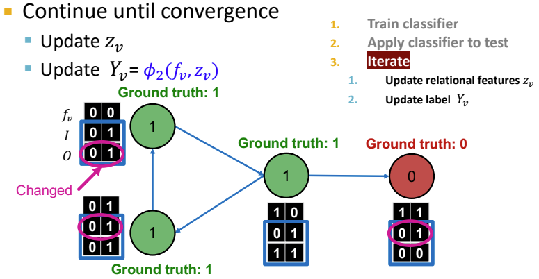 Iterative Classification의 두 번째 단계는 위 과정을 수렴할 때까지 반복하는 것이다. 테스트셋에서 $\phi_1$을 기반으로 label $Y_v$를 설정하고, $z_v$를 계산한 다음 $\phi_2$와 함께 label을 예측한다. 각 node $v$에서 반복하며 모든 이웃 node의 $Y_u$로 부터 $z_v$를 업데이트 하고, 새로운 $z_v(\phi_2)$를 통해 $Y_v$를 업데이트하는 것을 계속 반복한다. 이때 값이 안정화(stabilize)되거나 최대 반복 수에 도달할 때 까지 이를 계속한다. 그러나, Iterative Classification 역시 값이 수렴되지 않을 수 있다는 문제점이 존재한다.