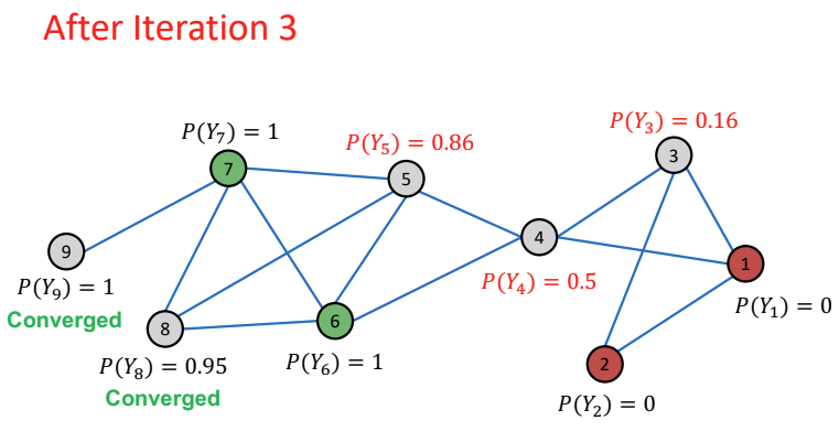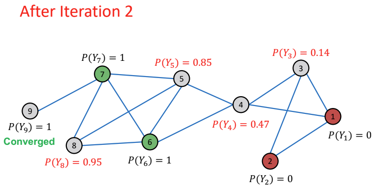 위 전체 과정을 한 번 더 반복하게 되면 node 3, 4, 5, 8의 값은 업데이트 되고, node 9의 값은 Converge하게 된다.