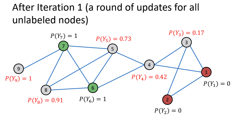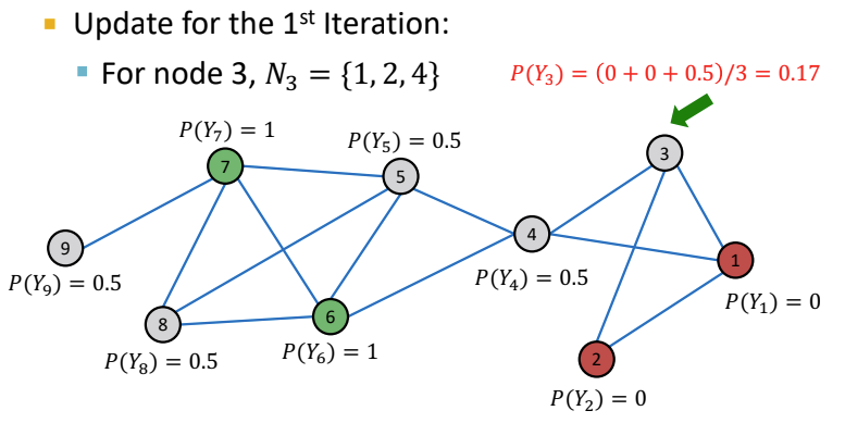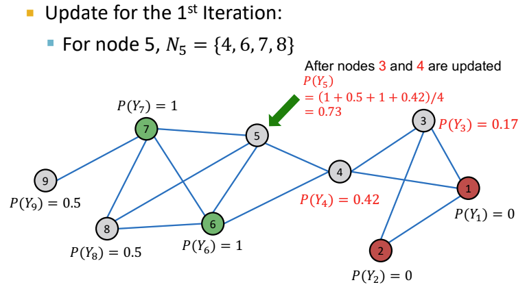 위 그림은 Relational Classifier의 학습 과정을 나타낸다. 라벨링된 node는 초록색인 경우 1로, 빨간색인 경우 0으로 할당되고, 라벨링 되지 않은 회색 node는 0.5로 초기값을 할당한다.