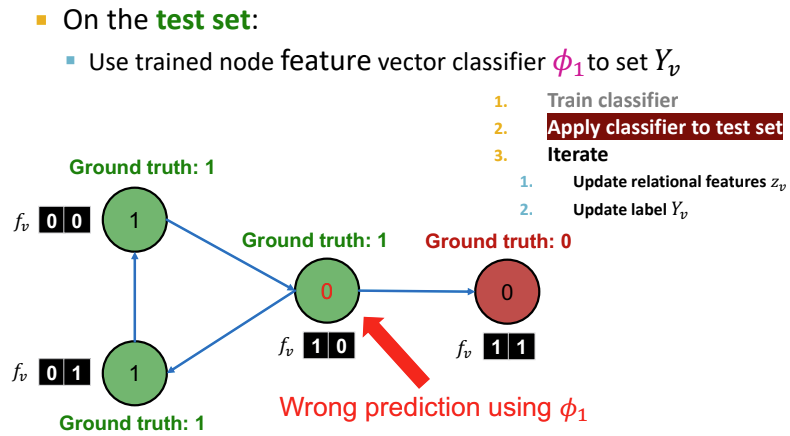 두 번째 단계에서는 학습된 Classifier $\phi_1$를 하여 $Y_v$를 설정한다. 위 과정에서는 Classifier가 제대로 학습되지 않아서 node의 라벨을 0으로 잘못 예측한 것이다.