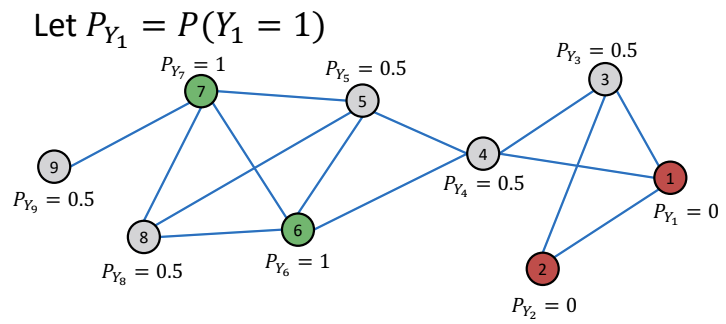 \[ P(Y_v = c) = \frac{1}{\sum_{(v,u) \in E} A_{v,u}} \sum_{(v,u) \in E } A_{v,u} P(Y_u = c) \]