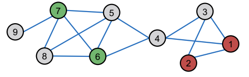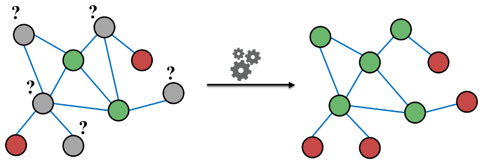 초록색 노드와 연결된 회색 노드의 경우 초록색일 확률이 높고, 빨간색 노드와 연결된 회색 노드의 경우는 빨간색일 확률이 높을 것이다(Guilt-by-association). 위에서도 언급했듯 Semi-Supervised Learning을 할 때는 이와 같은 가정을 기반으로 진행하며, 그래프가 주어졌을 때 labeling이 되어 있지 않은 노드의 색을 찾는 것이 목표다.