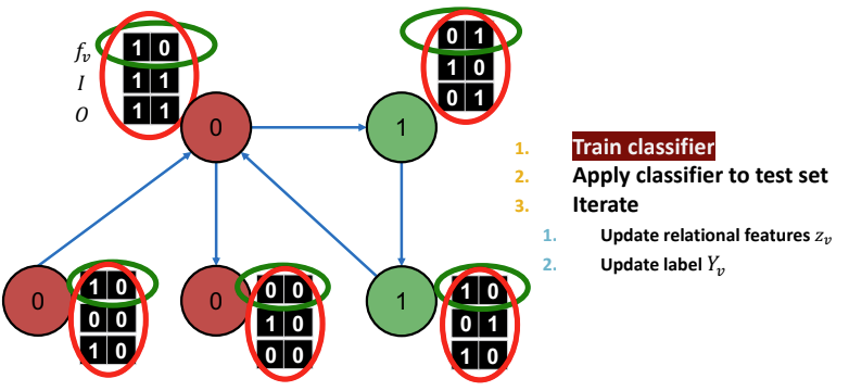 Local Classifier는 초기 label을 할당하는 단계다. node attributes/feature를 기반으로 label을 예측하며, 일반적인 classification task를 의미한다. 그러나, 이는 network information은 사용하지 않는다. 그렇기 때문에 Local Classifier는 회색 노드에 초기 label을 지정하기 위해서 초기에 한 번만 적용된다.