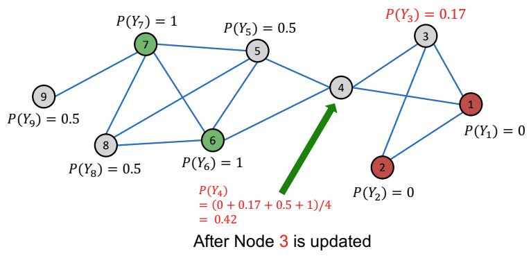 node 3을 업데이트하고 난 후 node 4를 업데이트 한다. node 4의 경우 이웃 node로 node1, 3, 5, 6를 가지고 있다. 각각 node의 probability $Y$를 기반으로 average 하면 0.42라는 값이 도출된다.