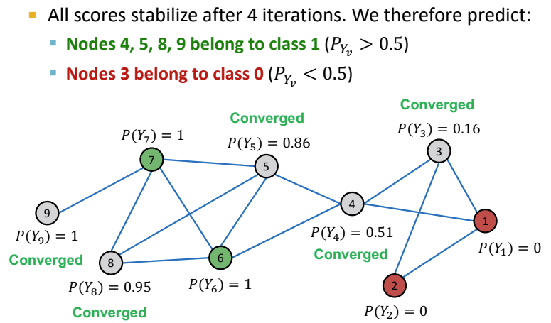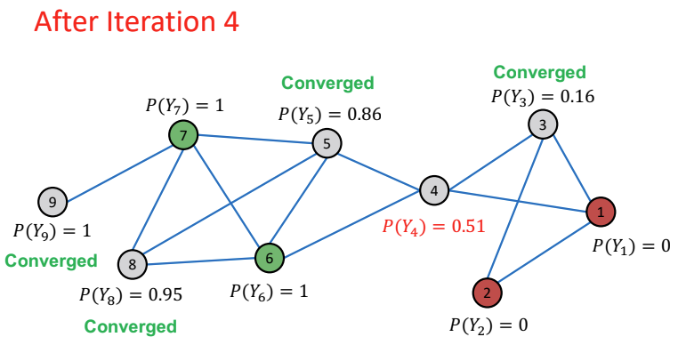 총 5번을 수행한 결과 모든 node의 값이 수렴하였으며, 이 때의 값을 기준으로 $P(Y_v)$의 값이 0.5보다 큰 경우 라벨을 1로 예측하고, 0.5보다 작은 경우 라벨을 0으로 예측한다.