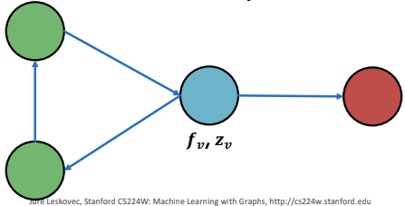 Relational Classifier는 node의 속성하지 않았다. 단순히 node의 라벨을 가지고 라벨링 되지 않은 node의 라벨을 예측하는 semi-supervised learning을 진행하였다. iterative classification의 메인 아이디어는 이웃 node의 label $z_v$ 뿐만 아니라 node의 속성 $f_v$까지 고려한다는 것이다.