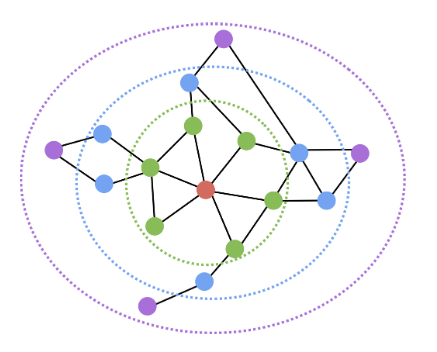 위 문제를 해결하기 위해 거리 기반, 경로 기반, 중첩 기반 등 다양한 접근법이 제안되었으며, 이 중 거리 기반 접근법 먼저 알아보자. 거리 기반 접근법은 두 노드 사이의 거리가 충분히 가까운 경우 유사하다고 간주한다. 예를 들어, 이때의 충분한 정도를 2로 설정한 경우 빨간색 노드는 초록색, 파란색 노드와는 유사하지만, 보라색 노드와는 유사하지 않다고 판단한다.