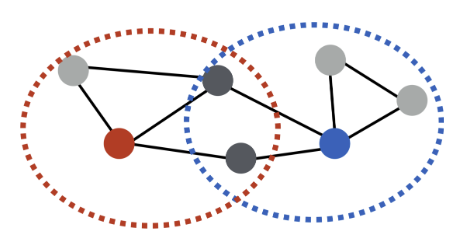 중첩 기반 접근법은 두 노드가 서로 많은 이웃을 공유할 경우 유사하다고 간주한다. 아래의 그림처럼 빨간색 노드와 파란색 노드는 서로 두 명의 이웃 노드를 공유하기 때문에 유사도를 2로 판단한다.