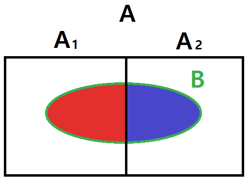 위 수식은 사건 $B$가 발생했을 때 사건 $A_1$이 발생할 확률을 의미한다. 이는 전체 사건 $B$가 발생할 확률에서 $A_1$가 발생할 확률을 계산하는 문제로 이해할 수 있다.