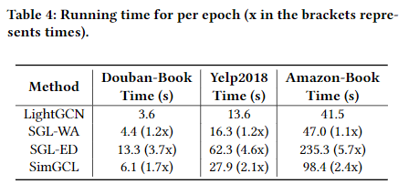 시간 복잡도만 본다면 SimGCL이 왜 효율적이라고 하는지 모를 수 있다. Graph perturbation 연산은 CPU에서 연산이 수행된다. 반면에 본 논문에서 제안하는 SimGCL의 경우 Graph Convolution 연산을 수행할 때 노이즈를 만들어 사용하기 때문에 GPU에서 연산이 가능하다. 따라서, 매우 효율적으로 연산이 가능하다.