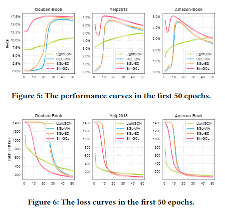 LightGCN의 경우 가장 간단하기 때문에 제일 먼저 수렴하는 것을 확인할 수 있으나, Douban-Book의 경우 수렴 값도 제일 높은 것으로 확인된다. SimGCL의 경우 GCL에 비해서는 수렴속도가 빠른 것을 확인할 수 있다.