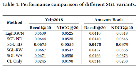 SGL-ED의 경우 성능이 우수하지만, SGL-ND의 경우 SGL-RW 에 비해 성능이 저하되는 것을 볼 수 있다. 이는, CL Loss가 성능 향상에 주요한 원인인 것에 반하여, Graph Augmentation은 예상만큼 효과적이지 않을 수 있다는 것을 의미하고, 일부는 성능을 저하시킬 수 있다는 것을 의미한다.
