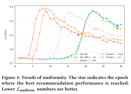 $\mathcal{L}_{\text{uniform}}$은 낮을수록 좋은 값을 띈다. 초반에 낮은 Loss 값을 보이는 이유는 본 논문에서 Xavier initialization을 사용했기 때문이다. 실제 학습은 peak를 찍은 후 안정되는 부분을 보면 된다. SimGCL의 경우 낮은 $\epsilon$일 때보다 높은 $\epsilon$일 때 학습이 잘 되는 것을 확인할 수 있으며, SGL의 경우 상대적으로 수렴 속도가 느린 것을 확인할 수 있다.