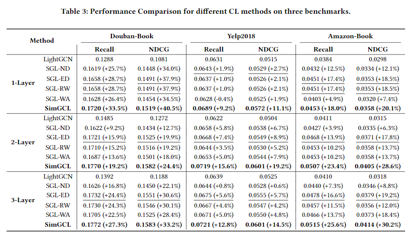 SGL과 SimGCL의 성능 비교결과, SGL과 SimGCL 모든 결과가 LightGCN 보다 우수한 성능을 보이고 있다. Bouban-Book 데이터셋에서 가장 큰 성능 개선을 보여주었으며, Layer의 수가 1인 경우에 가장 성능이 좋았다. 본 논문에서는 Layer를 3개 까지만 쌓아서 사용했는데, SGL과 SimSGL은 일반적으로 Layer가 낮을 때 성능이 우수한 것으로 확인되었기 때문이다.