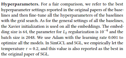 본 논문에서는 Douban-Book, Yelp2018, Amazon-Book 데이터를 활용하여 실험을 진행하였다. 실험 결과를 비교하기 위해 벤치마크 모델은 Mult-VAE, DNN+SSL, BUIR, MixGCL을 사용하였다. 자세한 파라미터 세팅은 아래의 그림으로 대체한다.