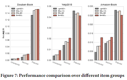 LightGCN은 별도의 처리 없이 제품을 추천하기 때문에 모델을 학습하는 과정에서 인기 있는 제품의 영향을 많이 받게 된다. 반면에, SGL과 SimSGL의 경우 CL 학습을 통해 인기 있는 제품을 없해거나, 제품 간의 균일성을 통해 인기 있는 제품만 추천 되는 것을 방지할 수 있어서 Long-tail Distribution을 가진 추천 시스템 분야에서 매우 효과적으로 활용될 수 있다.
