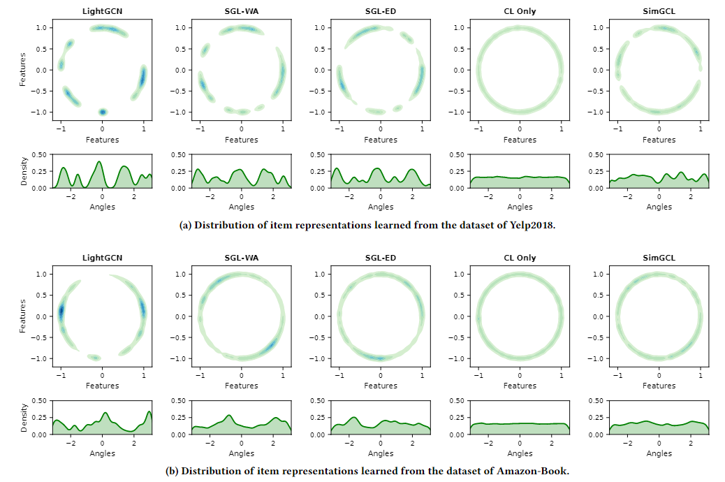 실험 결과, LightGCN은 일부 공간에 클러스터링 되어 있는 것을 확인할 수 있고, SGL-WA, SGL-ED의 경우 LightGCN에 비해 조금 더 균일한 것을 확인할 수 있으며, Density 또한 덜 sharp 한 것으로 확인된다. 4 번째 그림의 경우 오직 CL Loss만 사용한 경우를 의미하며, 이때 가장 균일한 분포를 띄는 것을 확인할 수 있다.