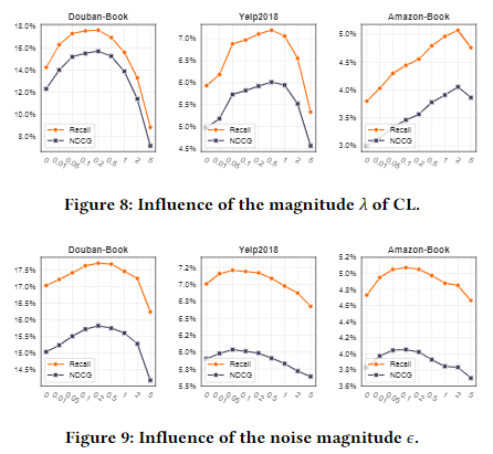 본 논문에서는 $\lambda$와 $\epsilon$ 두 개의 하이퍼파라미터가 존재한다. 각각의 하이퍼파라미터의 값에 따른 성능을 비교하고자 한다. $\lambda$의 경우 0.1, 0.2 인 경우에 가장 성능이 우수한 것을 확인할 수 있다. 그러나, Amazon-Book 에서는 $\lambda$의 값이 2까지 계속 성능이 개선되는 것을 확인할 수 있다. Amazon-Book의 경우 제품의 수가 많기 때문에, CL Loss의 값을 키워도 성능이 개선되는 것을 의미한다. [Figure 8]의 경우 $\lambda$가 변화할 때 $\epsilon$도 함께 조정된다. Yelp2018 이나 Amazon-Book를 살펴볼 때 보다 정교하게 조정할 수 있다고 판단되기 때문에 본 논문에서는 $\lambda$를 고정하고 $\epsilon$을 조정하면서 실험하였으며, 실험 결과는 [Figure 9]와 같다. 실험 결과 $\epsilon$이 0.1인 경우에 가장 성능이 우수한 것으로 확인된다. 이때 Xavier initialization을 쓰는 것이 Gaussian initialzation을 쓸 때보다 3~4% 정도 성능이 개선되었다고 한다.