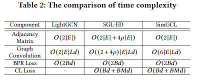 $\rho$는 얼마만큼 엣지를 가지고 있을지에 대한 비율을 의미한다. 만약 dropout rate가 0.1이라면 $\rho$는 0.9가 된다. CL을 수행하기 위해서는 Graph Augmentation이 필요하기 때문에, 저만큼의 복잡도에 대한 정보가 추가로 필요하다. 반면에 SimGCL의 경우 Graph Convolution을 수행할 때 노이즈를 추가해 CL을 수행하기 때문에 $\mathcal{O}(6|E|Ld)$가 된다.
