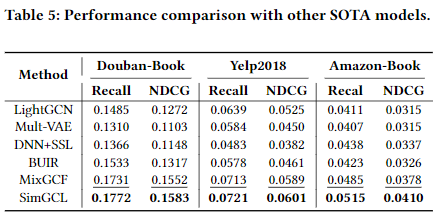 이전까지는 전부 SimSGL의 성능을 SGL 혹은 LightGCN 만 비교하였다. 4.4 절에서는 다른 SoTA 모델과 비교하여 성능이개선되었는지 확인하였다. 당연히 모든 데이터셋에 대해 SimGCL의 성능이 가장 우수한 것으로 확인된다. MixGCF의 성능도 우수한 것으로 보인다.