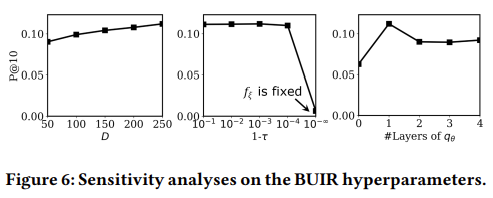 $\text{BUIR}$에는 Latent Dimension $D$, momentum coefficient $\tau$, predictor $q_{\theta}$가 존재한다. 이를 달리하여 성능이 얼마나 변화하는지 실험하였다. 실험결과, $\tau$는 [0.0, 1.0]에서 가장 우수한 성능을 발휘하고 있다. $\tau$가 높을수록 Encoder가 제대로 학습하는 것을 의미한다. $q_{\theta}$는 Layer의 수가 하나인 경우에 가장 우수한 성능을 발휘하고 있다. 이는, Layer의 수가 증가할수록 두 Encoder를 최정화하는 것이 어렵기 때문이라고 판단하였다.
