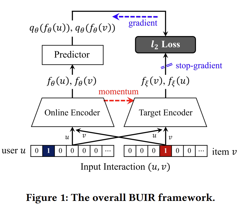 기존 연구에서 제안된 End-to-End 방식과 BUIR 간의 주요 차이점은 $f_{\theta}$와 $f_{\xi}$가 서로 다른 방식으로 업데이트 된다는 것이다. Online Encoder는 Output과 Target 사이의 오류를 최소화하는 방식으로 학습하지만, Target Network는 출력을 일관되게 유지하기 위해 momentum update를 기반으로 천천히 업데이트 한다. 이때 Predictor $q_{\theta} : \mathbb{R}^D \rightarrow \mathbb{R}^D $ 즉, Mean squared error를 통하여 BUIR의 Loss를 최소화 한다.