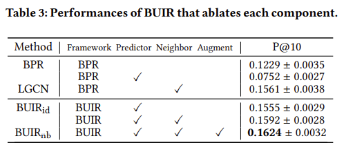 $\text{BUIR}$ 에서 각 구성 요소 즉, Predictor, Neighbor, Augment 의 효율성을 검증하기 위해 각각의 요소를 제거하여 아래의 표와 같은 실험을 진행하였다. 실험 결과, Predictor, Neighbor, Augment 각각 추가할 때마다 성능이 개선되는 것을 확인할 수 있다.