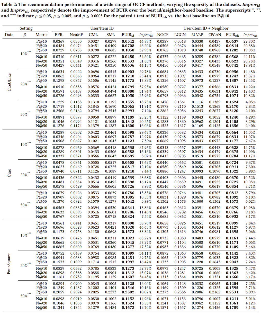 실험 결과는 Table2와 같으며, 본 논문에서 제안하는 BUIR의 성능이 가장 우수한 것을 확인할 수 있다. 모든 데이터셋에 대해서 유의미한 정도의 차이를 보이고 있다. 또한, 데이터가 더 sparse한 경우에 성능이 더욱 우수한 것을 확인할 수 있다. $\text{BUIR}_{id}$는 Embedding Layer에서만 BUIR을 사용한 것을 의미한다. $\text{BUIR}_{id}$는 LightGCN 방법에서 BUIR을 적용한 것을 의미한다.