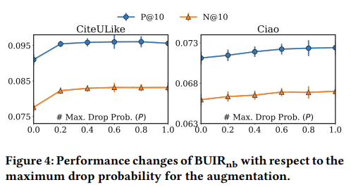 모든 데이터셋에서 $\text{BUIR}_{id}$의 성능이 우수한 것을 확인할 수 있다. $\text{BUIR}_{id}$는 실제 사용자가 구매하지 않은 제품 중에서 구매할 가능성이 높은 제품 간의 상호작용을 사용할 가능성이 높기 때문에 데이터가 Sparse할 경우 보다 우수한 성능을 발휘하고 있다.