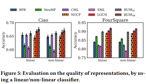 $\text{BUIR}$을 통해 도출된 Representation의 성능을 검증하기 위해 , 다운스트림(Downstream) 태스크를 진행하여 실험을 진행하였다. 실험 결과, $\text{BUIR}_{id}$와 $\text{BUIR}_{nb}$의 성능이 우수한 것을 확인할 수 있다.
