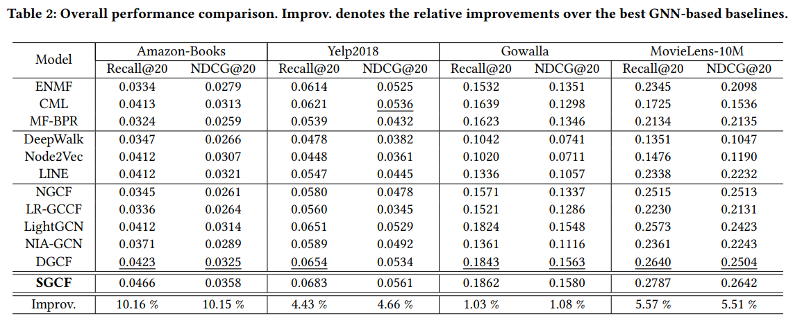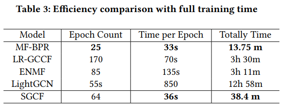 주목할만한 결과로는 SGCF 기법의 속도가 MF-BPR 을 제외한 다른 기법에 비해 매우 우수한 것을 확인할 수 있다. SGCF 기법의 경우 그래프 기반 기법임에도 불구하고 MF 기반 기법과 비슷한 수준의 속도를 보여준다. Table 4를 보면, 빠른 속도 뿐만 아니라 성능 역시 우수한 것을 확인할 수 있다.